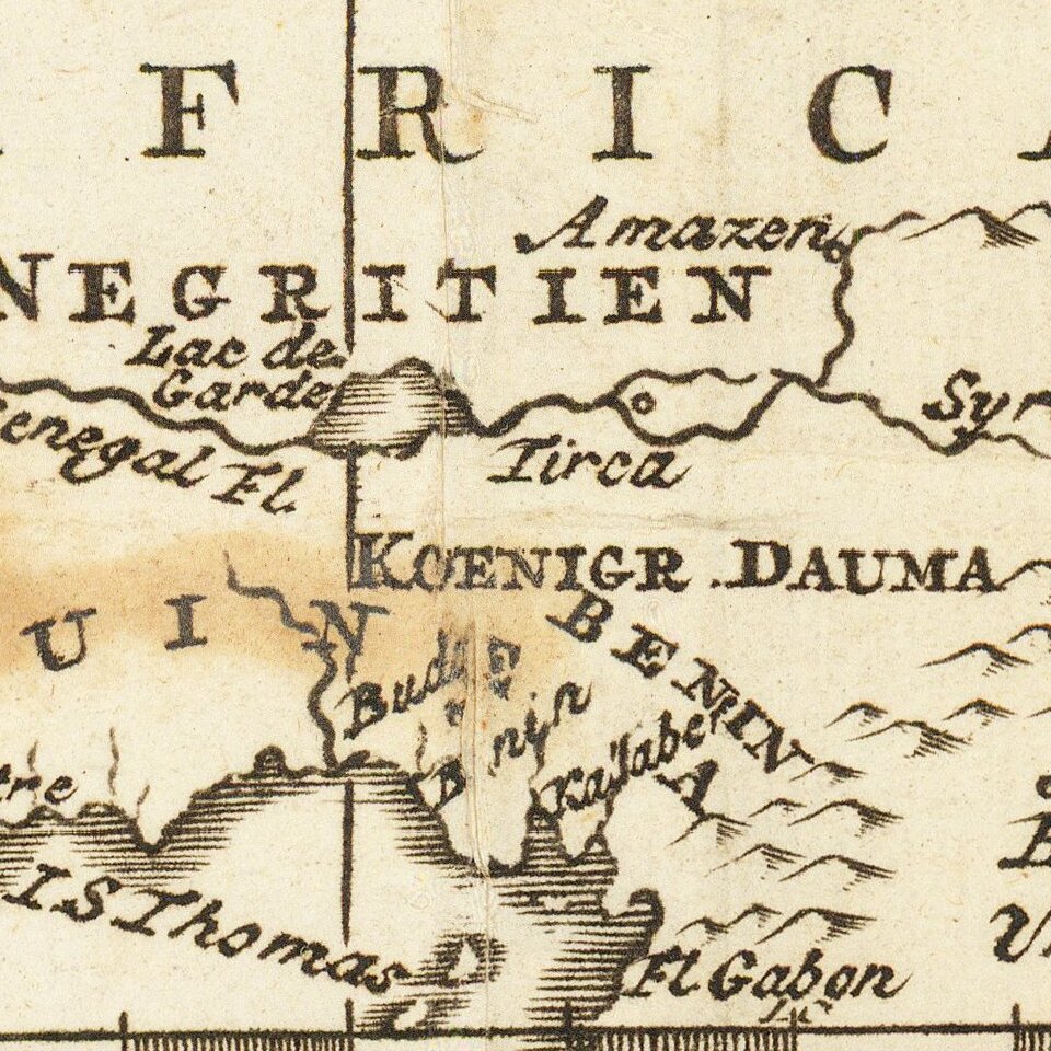 While the title explains that this map shows the known world, there are also several conjectures contained within the map. For example, there is a channel cutting off Patagonia from the rest of South America. The most significant of these conjectures is in the interior of North America. Stretching from the west coast to the Great Lakes is a fluvial system titled here the Fl de l’Ouest. The idea of a River or Sea of the West stems from the work of the renowned geographer Guillaume Delisle, although Delisle never included the feature on his own published maps.