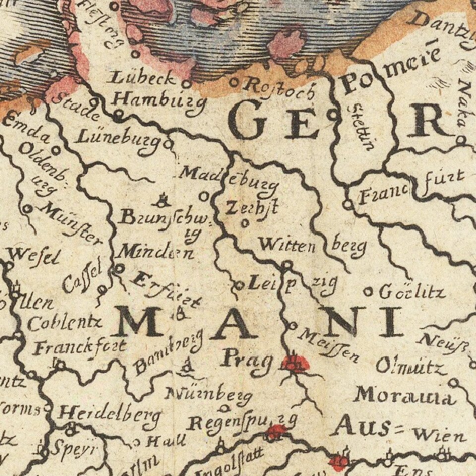 Mathaus Merian (1593-1650) was the father of engraver Matthäus the Younger, and of the painter, engraver, and naturalist Maria Sibylla Merian. He was born in Basel, Switzerland and trained in engraving in Zurich. After a time in Nancy, Paris and Strasbourg, he settled in Frankfurt. While there, he worked for Johann Theodor de Bry, the publisher and son of the travel writer. In 1617, he married Maria Magdalena de Bry, Johann Theodor’s daughter. In 1623, Merian took over the de Bry publishing house upon the death of his father-in-law. Merian’s best known works are detailed town views which, due to their accuracy and artistry, form a valuable record of European urban life in the first half of the sixteenth century