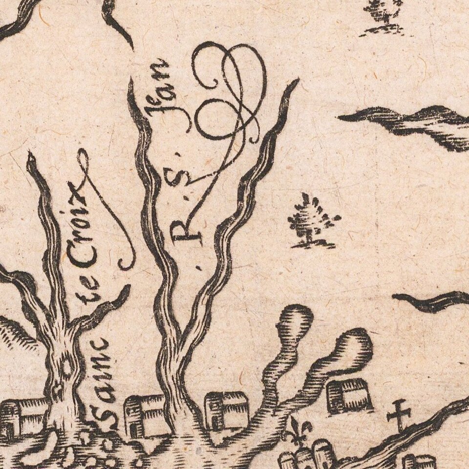 Although drawn primarily from a 1607 manuscript map by Champlain, Lescarbot's map appeared a 3 years prior to the first edition of Champlain's map. In addition, as pointed out in Mapping Boston, Lescarbot's was the first map to show Cape Cod. Also, several important place names appeared on the map for the first time, including Kebec (Quebec), Kinibeki (Kennebec), and P. Royal (Port Royal).
