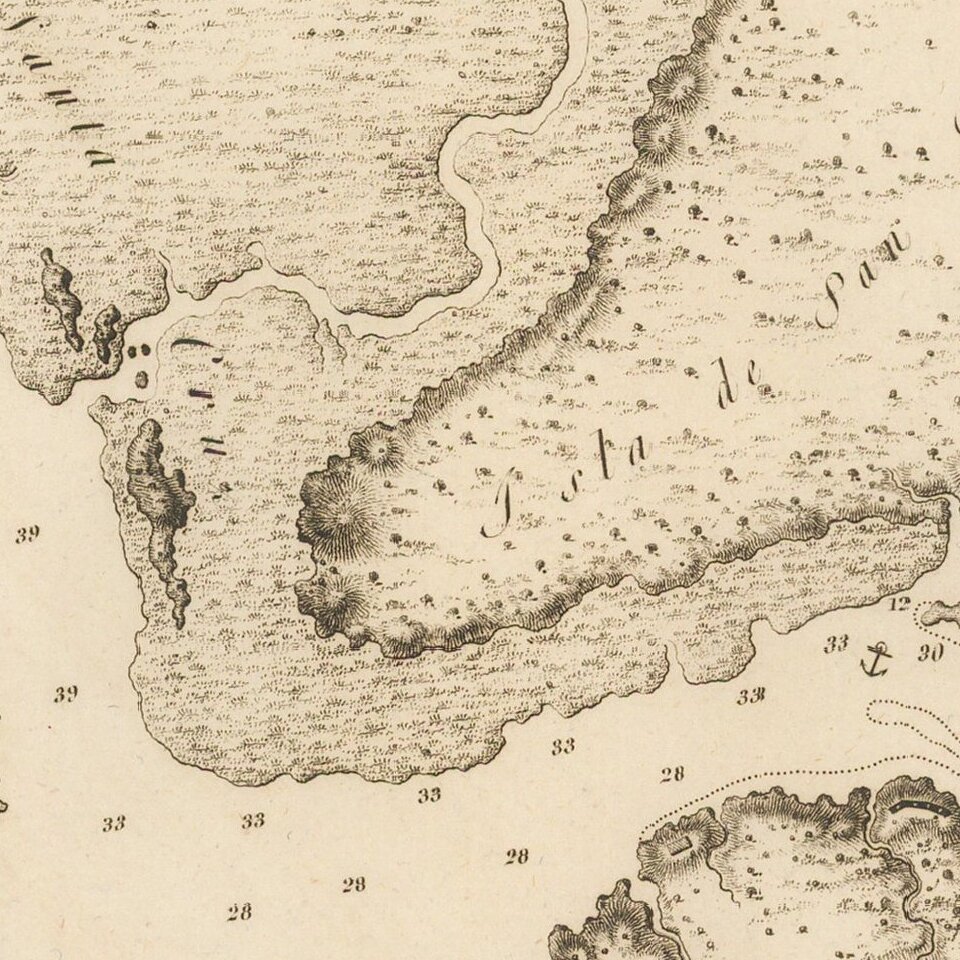 The Dirección de Hidrografía, or the Directorate of Hydrographic Works, was established in 1797. Its roots were in the Casa de Contratación, founded in 1503 in Sevilla, which housed all the charts of the Spanish Empire and oversaw the creation and maintenance of the padrón real, the official master chart. The Casa, now in Cadiz, was shuttered in 1790, but Spain still needed a hydrographic body. In response, the Dirección was created in 1797. One of its first projects was the publication of charts from the Malaspina Expedition (1789-1794). The Dirección oversaw not only publication, but also surveying. The Dirección was abolished in the early twentieth century, when their work was distributed to other organizations.