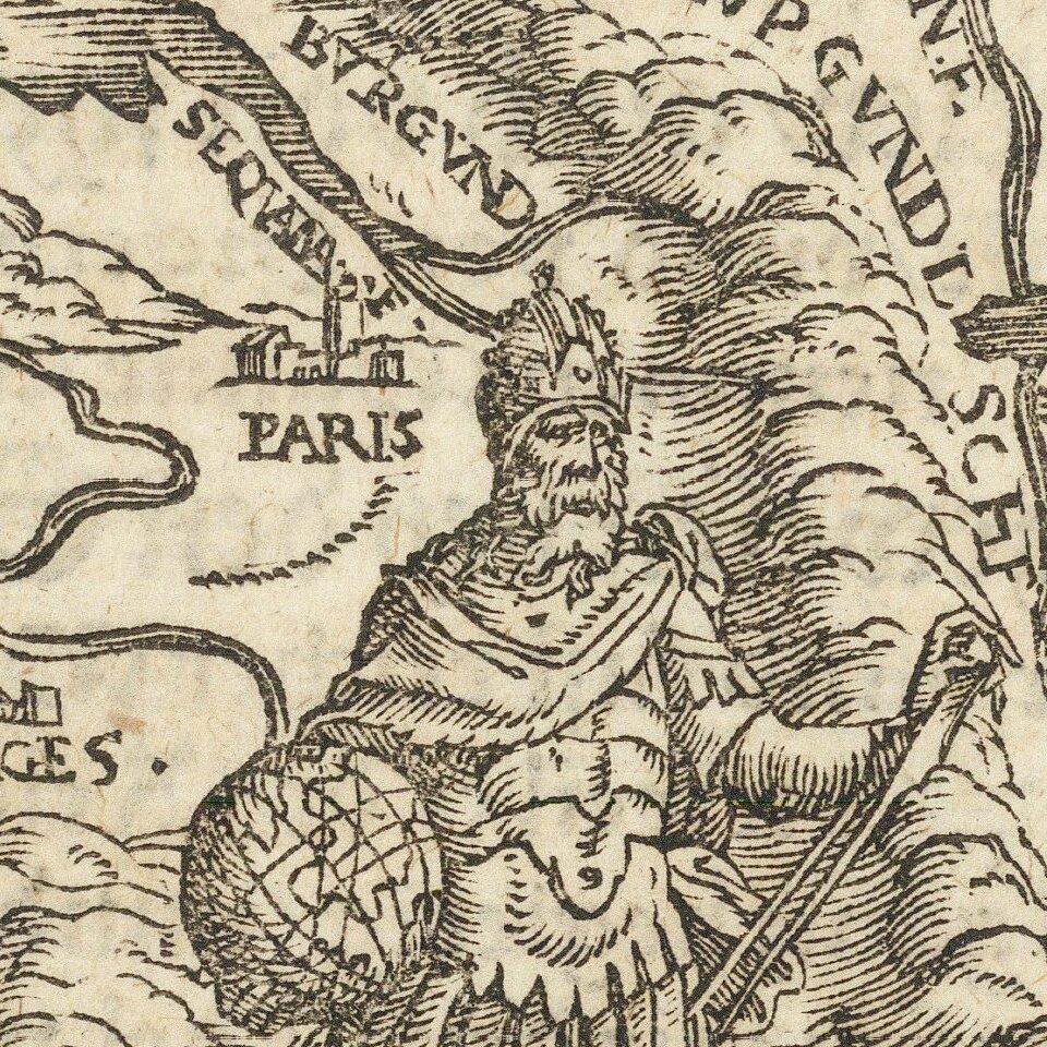 The map illustrates Charlemagne in the foreground, holding a globe aloft, with a map of France and neighboring regions as a background.