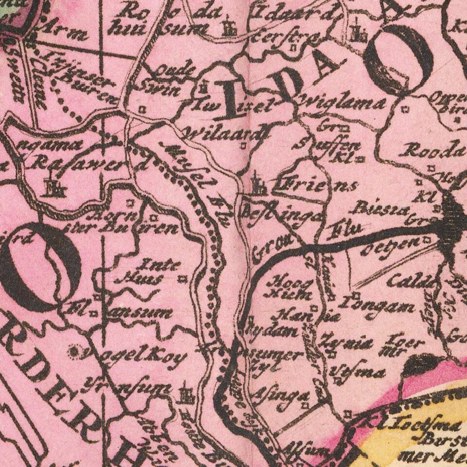Fine old color example of this rare edition of Schenk's map of the Friesland, on double thick paper.