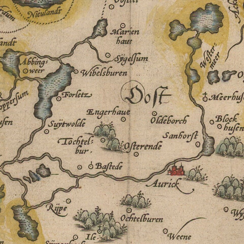 Nice example of Ortelius' map East Friesland, from his Theatrum Orbis Terrarum, the first modern atlas of the world.