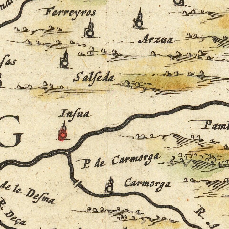 Major cities include Corunna, Mondonnedo, Rivadeo, Lugo, Oresn, Pontevedra, and Padron. Shows castles, walled cities, towns, rivers, mountains and many other details.