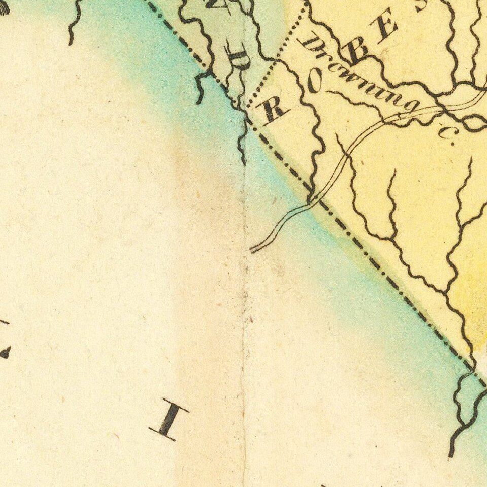 Many counties still not formed. Size includes text below map, which includes wonderful contemporary details concerning the topography, indigenous lands, rivers, climate, towns, population by county (divided into white, free colored, and slaves), internal improvements and natural curiosities. Most notable in the south is the notation of two sets of boundaries, one noted as being agreeable to the Charter.