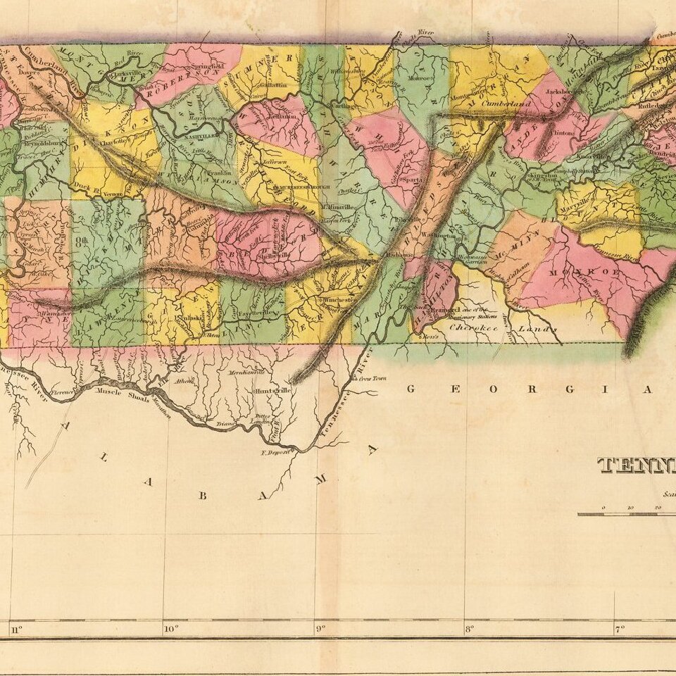 Old color example of one of the earliest obtainable maps of Tennessee, from the first edition of Carey & Lea's Atlas.