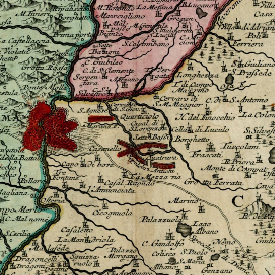 Scarce map of the "Stati del Sommo Pontefice," showing the area centered on Rome, controlled by the Pope.