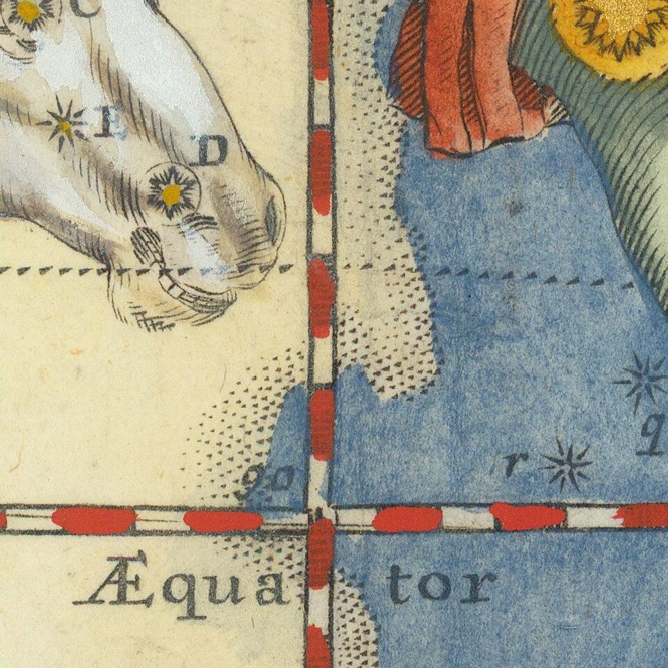 The constellations are shown as figures according to classical mythology and the zodiac as derived from Hevelius. The more recently named constellations are shown as scientific instruments. The paths of several comets are traced following a pattern established by Pardies. Specifically, this chart is an internal view of the sky centered on the equator focusing on the constellations Monoceros, Cancer, Gemini, Orion, Taurus, Canis Major, Lepus, Columba, etc.