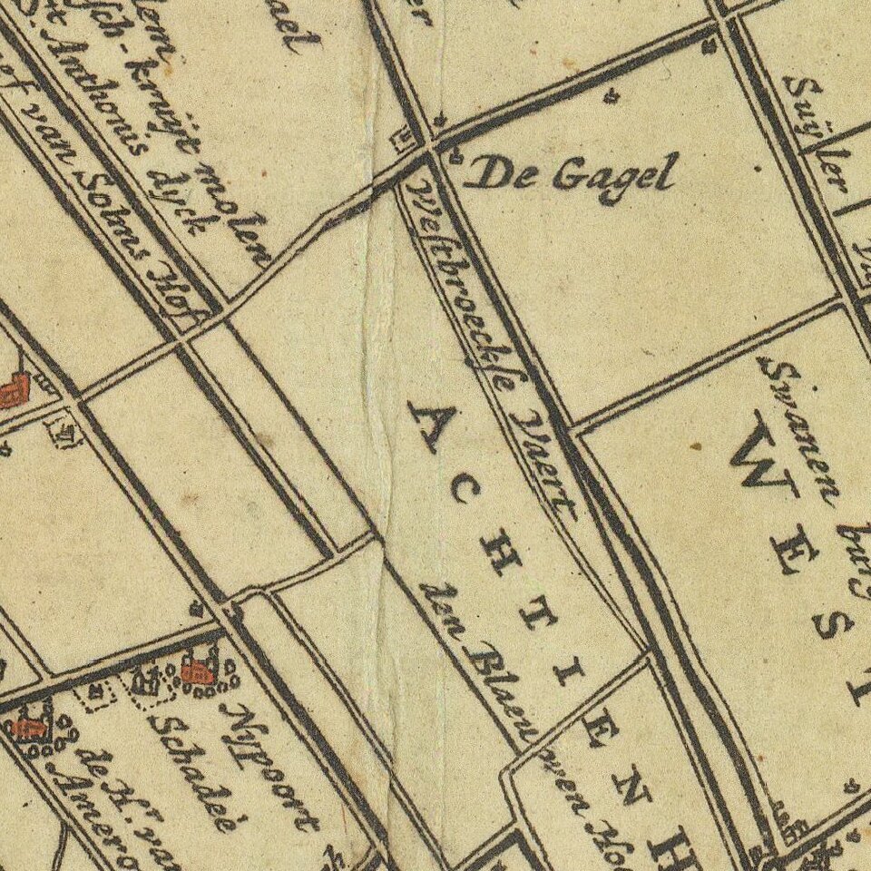 The map is oriented with west at the top, with Amsterdam at the fair right.