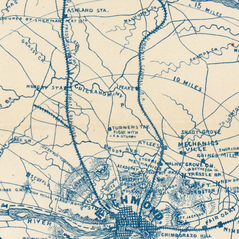 Scarce map of the area around Richmond, showing towns, railroad lines, roads, rivers, bridges, court houses, and other details.