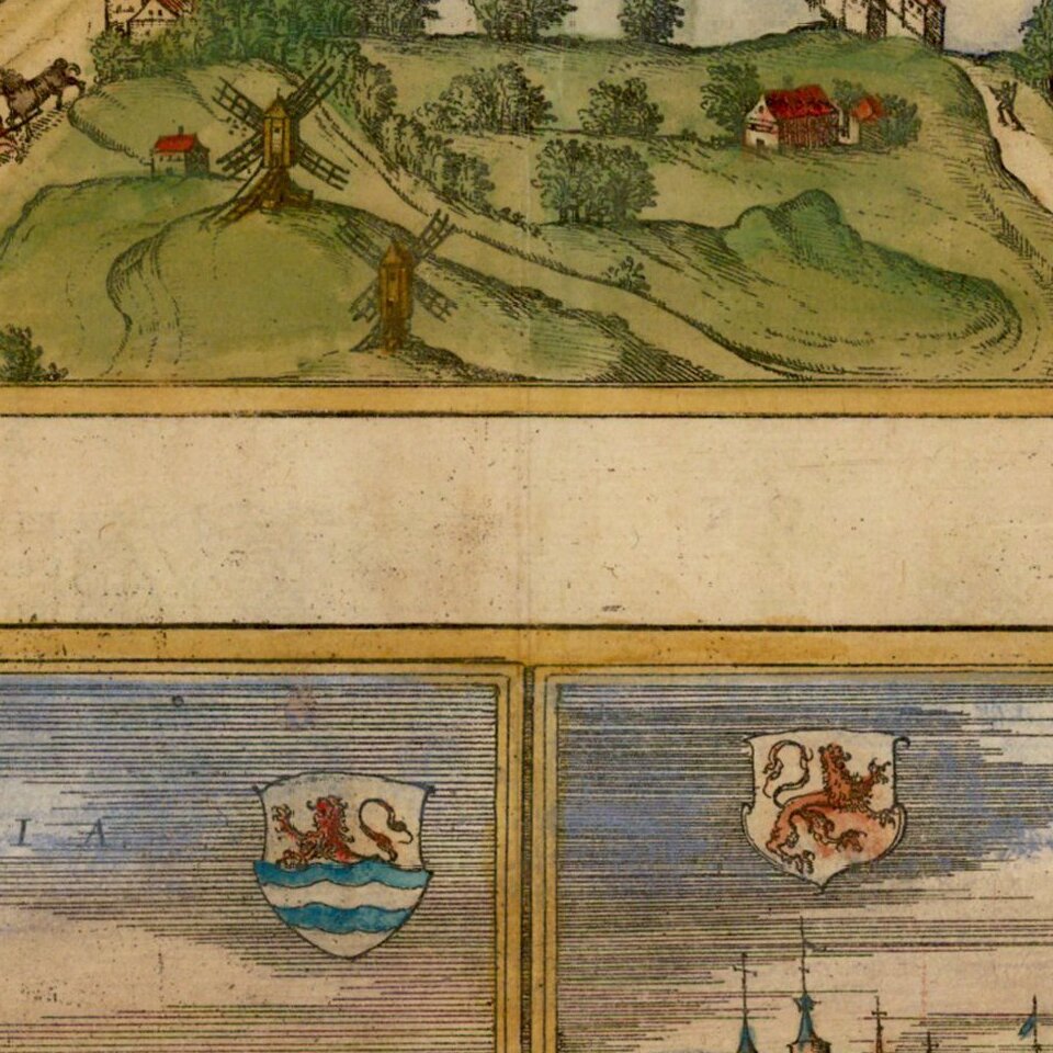 Georg Braun (1541-1622) was born and died in Cologne. His primary vocation was as Catholic cleric; he spent thirty-seven years as canon and dean at the church St. Maria ad Gradus, in Cologne. Braun was the chief editor of the Civitates orbis terrarum, the greatest book of town views ever published. His job entailed hiring artists, acquiring source material for the maps and views, and writing the text. In this role, he was assisted by Abraham Ortelius. Braun lived into his 80s, and he was the only member of the original team to witness the publication of the sixth volume in 1617.
