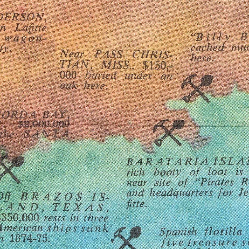 From the Lost Dutchman mine to John Dillinger's stash near Mercer Wisconsin, The map details a list of some of the most famous treasure legends and finds. Around the sides of the map are short vignettes telling the story of famous pirates.