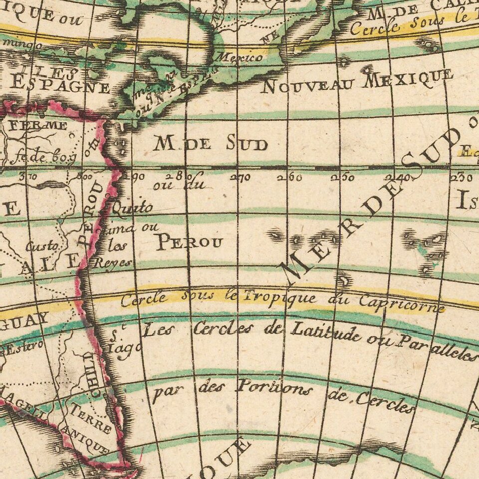 Rare map of the Western Hemisphere in mirror image format, from a very rare work by Pierre Moullart Sanson, the grandson of Nicolas Sanson the Elder.