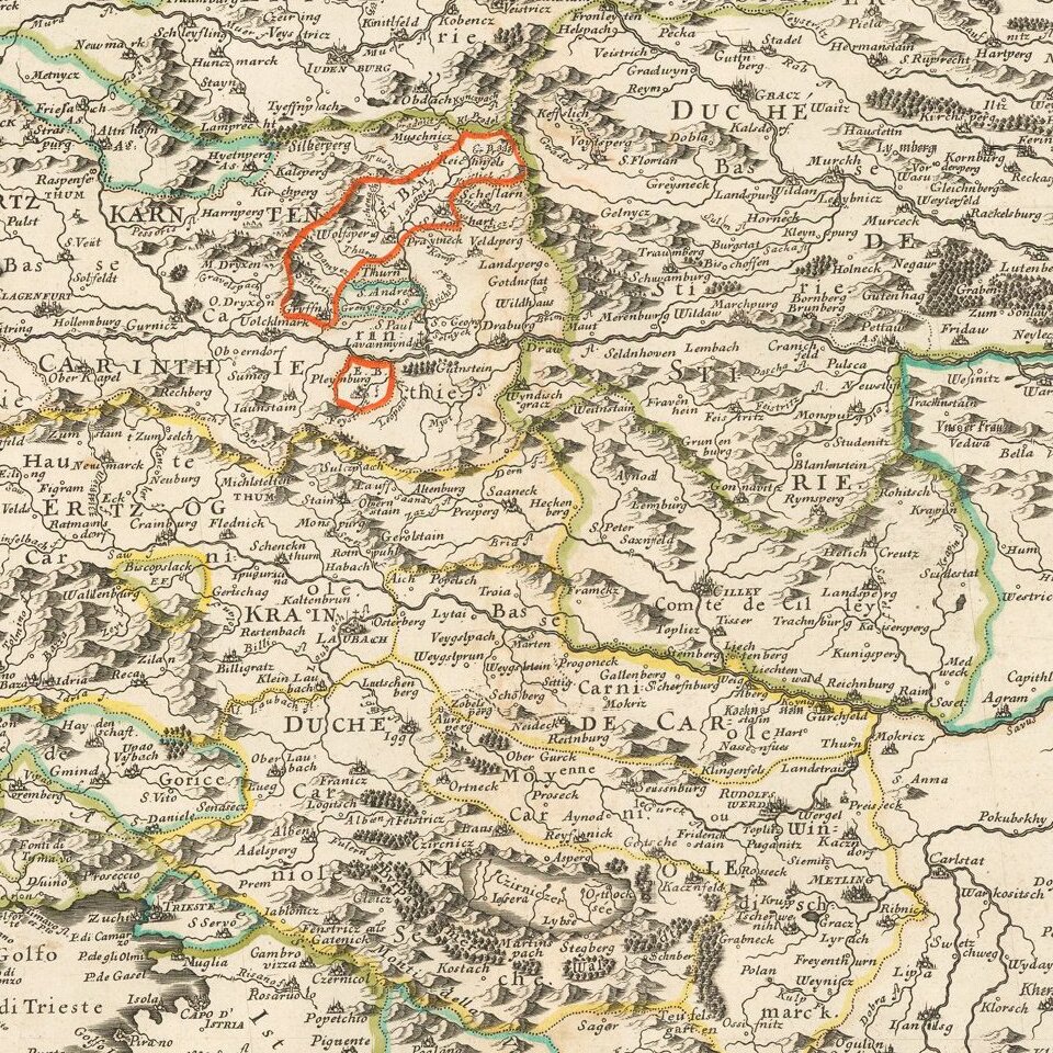 Nicolas Sanson's 1657 double-page engraved map of the Gulf of Venice in the southwest extending to southeastern Austria in the north, and to Croatia in the southeast.
