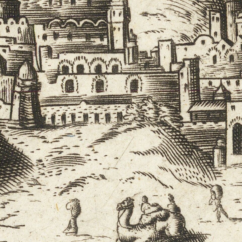 Duchetti's fine modern view of Jerusalem shows the City from the West. Laor noted that the view is likely based upon Stefano Du Perac's view of 1570, also published in Rome.