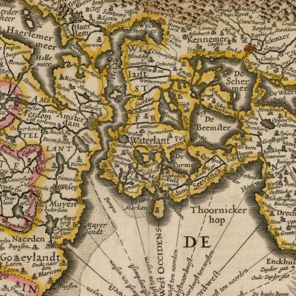 The present map is known in 4 states, including two early states by Willem Janszoon Blaeu, and one state each by Robout van den Hoeye and Justus Danckerts.