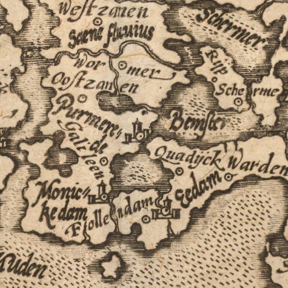 Nice example of this scarce map of Holland, oriented with west at the top, published in Cologne.