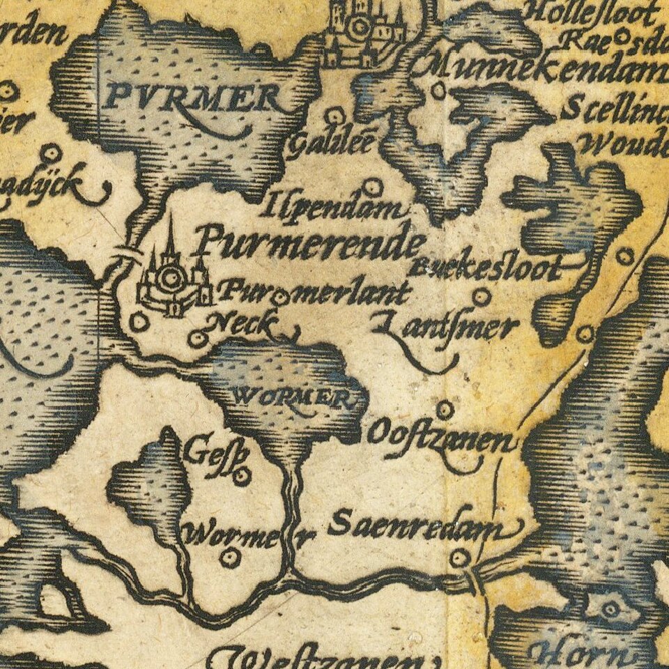 A nice full color example of Ortelius' map of Holland, drawn from Jacaob van Deventer's maps.