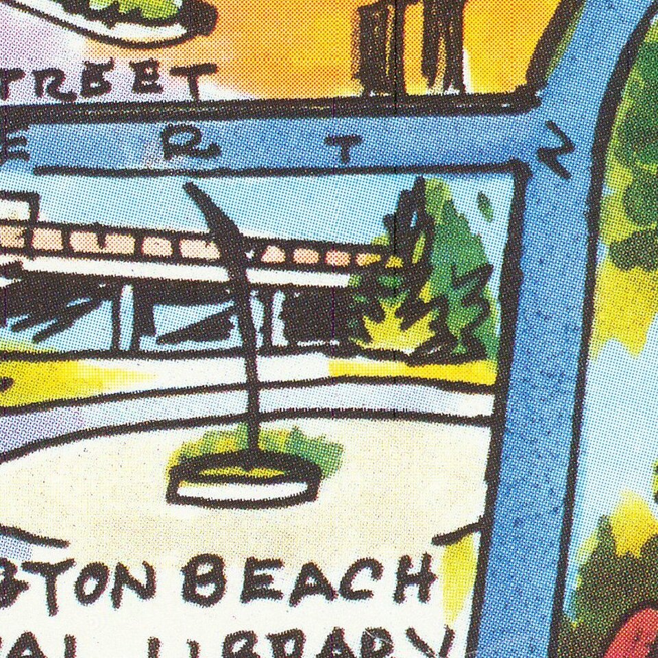 Huntington Beach is well-known for its surfing, though this almost entirely escapes the scope of the map. Businesses advertised cover a wide swath of industries and services, including private detectives, diners, carpet cleaners, real-estate agents, and much more. In all, this is a nice pictorial map of a great American beachside city.