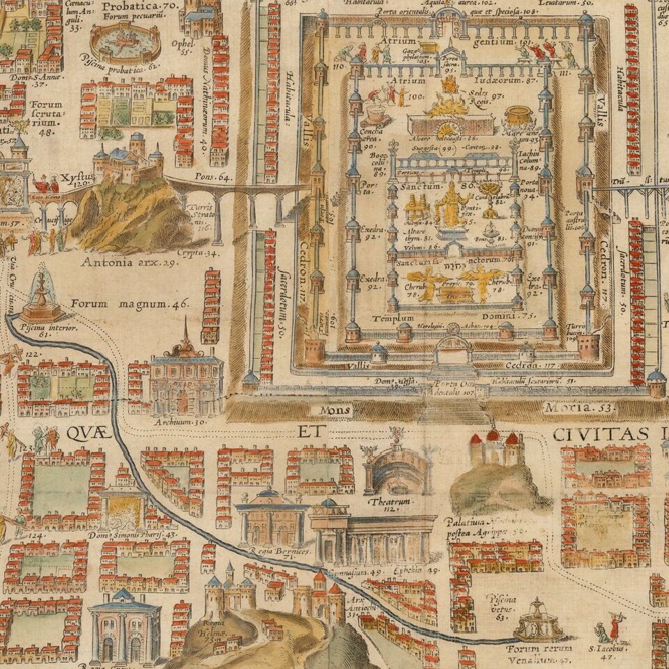 Decorative hand-colored example of Christan Van Adrichom's plan of ancient Jerusalem and its suburbs at the time of Jesus Christ, which was later copied by a number of early mapmakers for their works on the Holy Land.