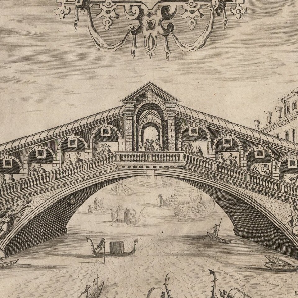 The Rialto Bridge is one of the earliest bridges in Venice. The first dry crossing of the Grand Canal was a pontoon bridge built in 1181 by Nicolò Barattieri. It was called the Ponte della Moneta, presumably because of the mint that stood near its eastern entrance.