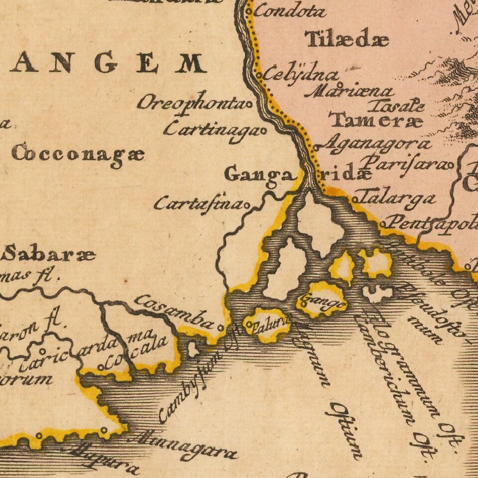Decorative map of ancient India, from Weigel's Descriptio Orbis Antiqui.