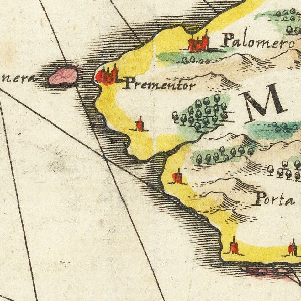 A beautiful map of the islands of Majorca, Minorca, and Ibiza, along with the contiguous Catalan Coastline.