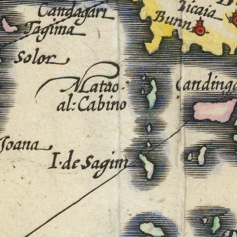 Another historical note is a cross mark in the interior of Borneo, showing one of the places traversed by the Portuguese Dom Manuel de Lima. This betrays Hondius' Portuguese source base, in this case the portolan charts of Portuguese cartographer Bartolomeu Lasso.