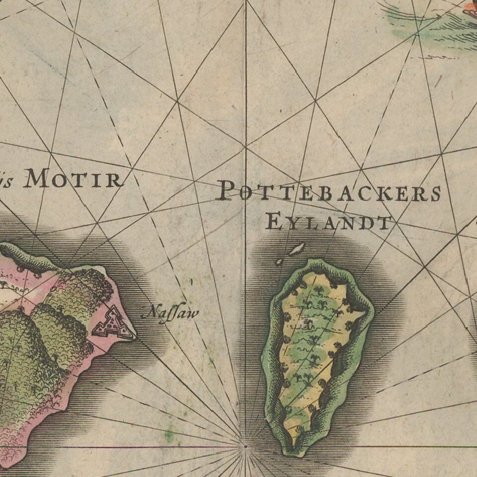 The map features a Moluccan couple in the lower right corner in Europeanized native dress. Indicative of the area's commercial importance, Jansson has filled the seas with both European and local ships, two of which are engaged in battle. Includes sea monsters, sailing ships and decorative compass. 2 roses are also shown.
