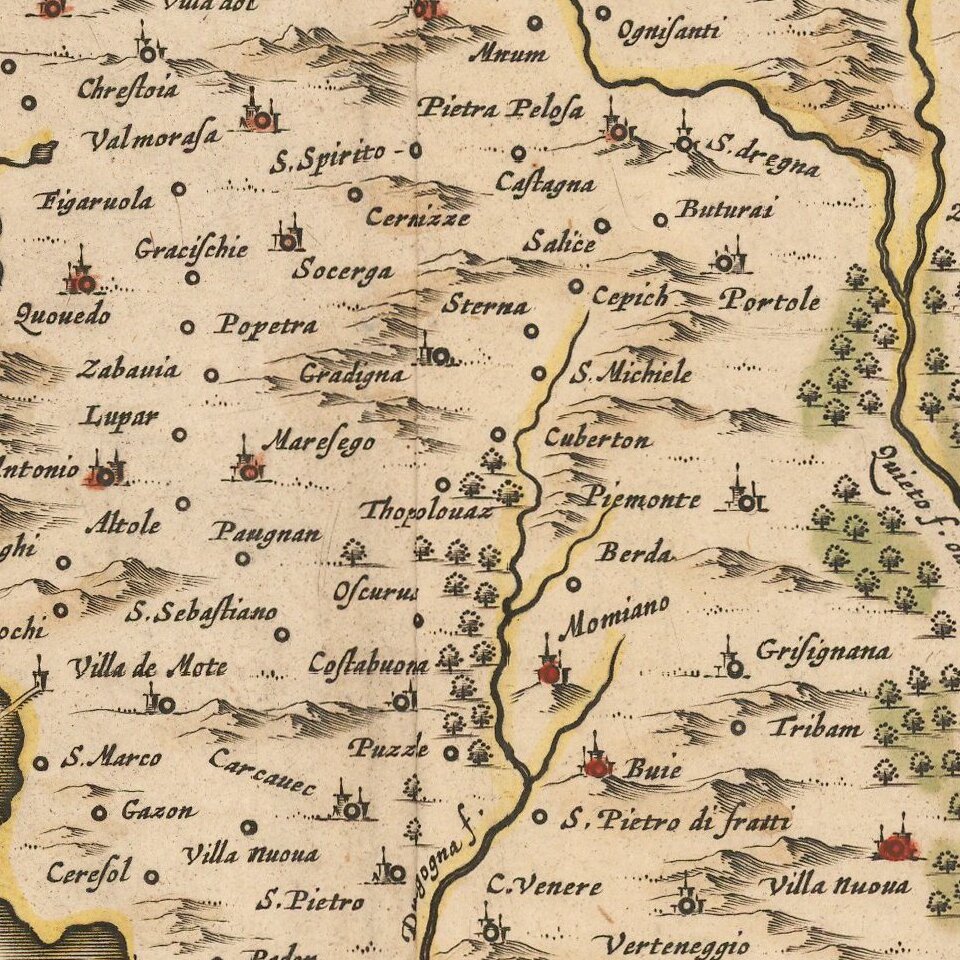 Shows the Istria peninsula, Gulf of Treiste and the nearby islands. Inland is a huge Czirnicser See (Lake Cerknica), which does not appear on Blaeu's map of the same title. This is an intermittent lake that can be completely dry for years. But when full, it is the largest lake in Slovenia. As a part of the Venetian Republic, this region contained many important sea ports that are highlighted on the map.
