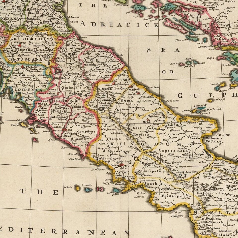 Striking and highly detailed map of Italy, divided into its various regions, from Senex's General Atlas.