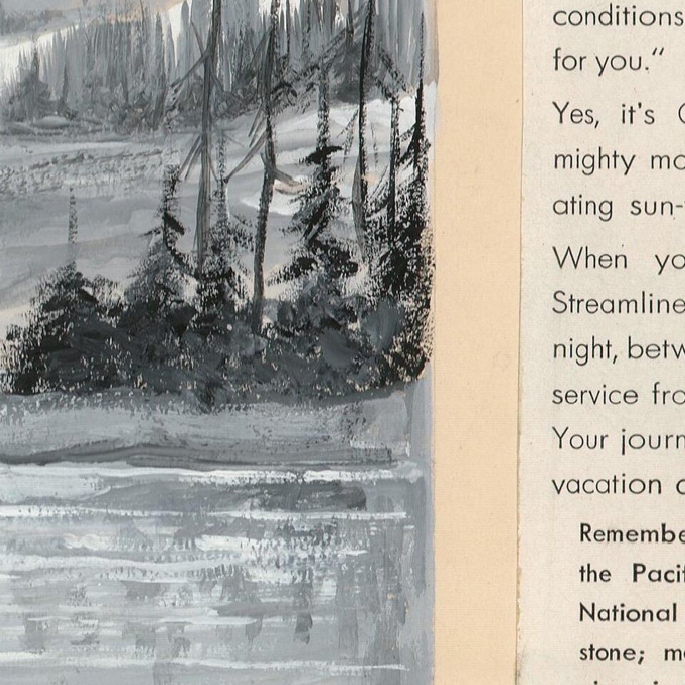 We have been able to locate a published version of this map that is part of the collection at Duke University. There are several notable differences between this preliminary mock-up and the printed version. For example, a radically changed version of the view is present, as is a changed version of the fisherman in the river. The map is much more detailed, with each of the states being labeled and much less emphasis being placed on the locomotive. In the printed version, a Union Pacific Streamliner, one of their newest engines, is placed closer to the viewer than one of the older steam locomotives. The print version of this ad was published in multiple different publications.