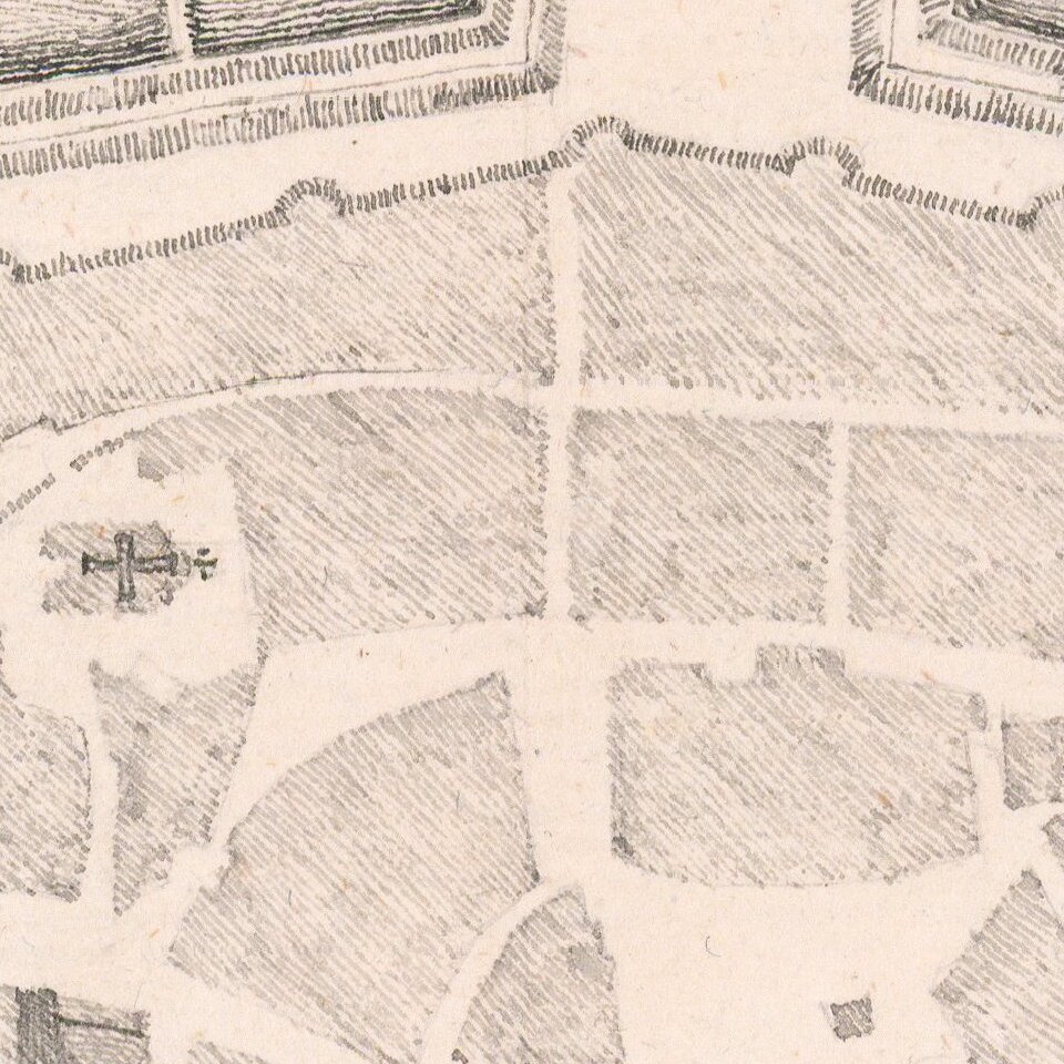 While the map focuses on the medieval city without its expansion, the handwriting on the roads indicates an early eighteenth-century hand and suggests a rough date for the creation of this document. The road labels are in German, while the title is in French (albeit using the German designation of Jägerndorf). Additionally, the title is written in a more elegant script, suggesting a later owner marked it after the road labels were initially inscribed.
