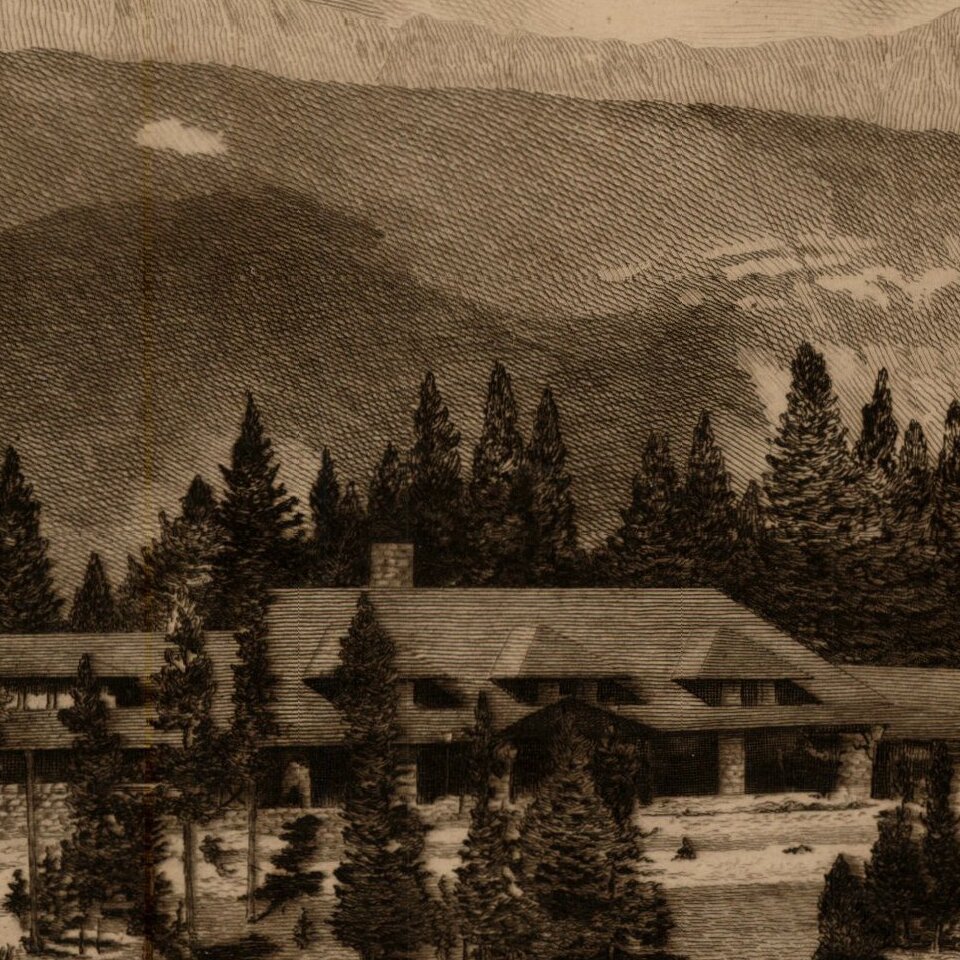 Striking engraving of the Jasper Park Lodge, celebrating its construction in 1921-22, with lake in the foreground, issued by the Canadian National Railroad.