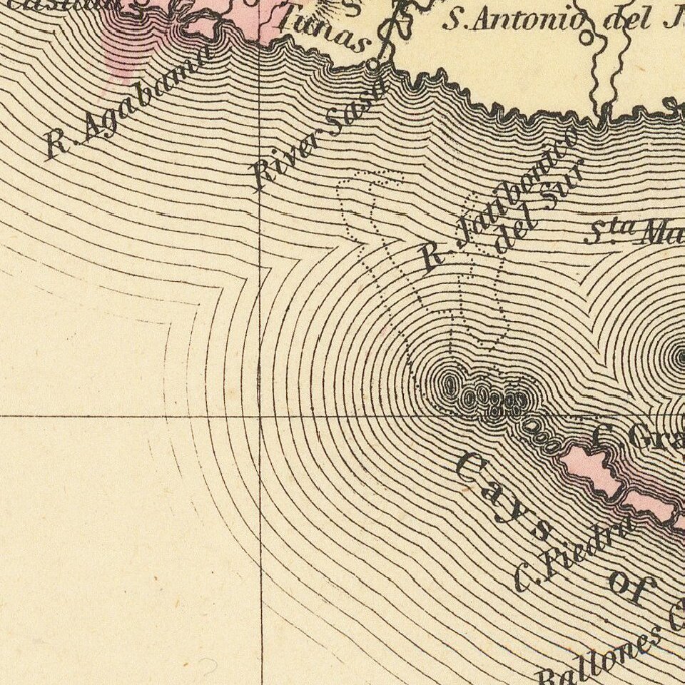 Attractive map of Cuba, the Florida Keys, the Bahamas, Jamaica, and the Caymans. Shows towns, rivers, mountains, etc.