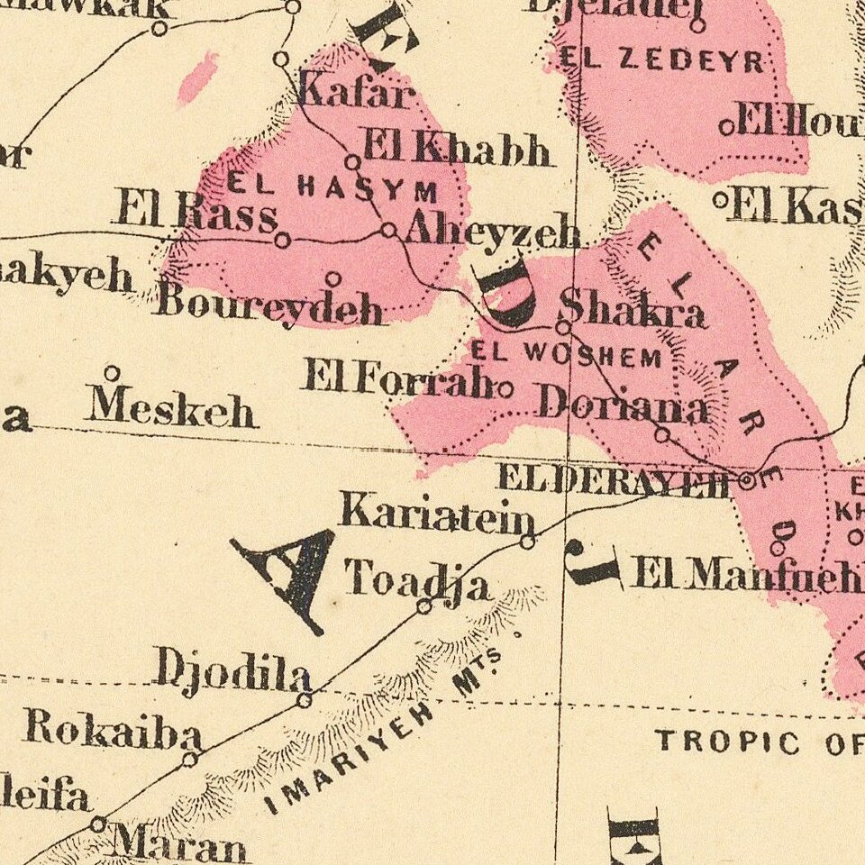 Decorative map of Turkey, Persia, Arabia, Afghanistan, Beloochistan and contiguous regions, with large inset views of Smyrna, Trebisond and Muscat.