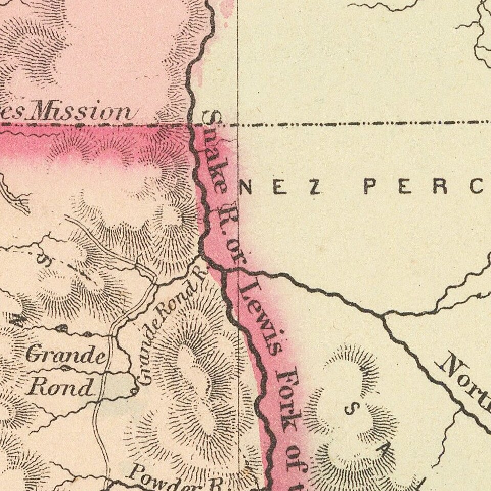 The map is colored by counties. Washington wraps around Oregon to the east of the Oregon State line, including the yet to be formed Idaho Territory. Includes many Indian tribes, forts, roads and early topographical notes. A few early counties east of the Cascades are just appearing, including Skamania, Walla Walla, Josephine and Wasco.