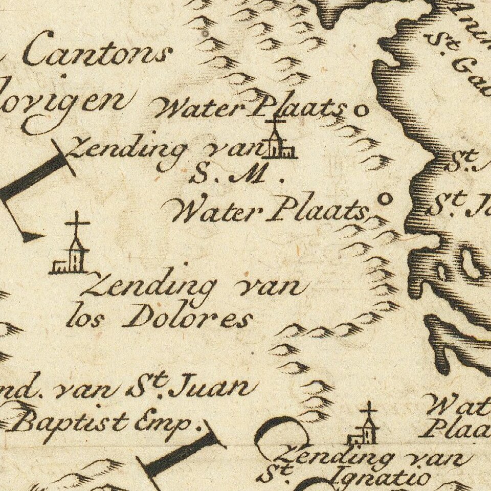 Below Los Virginos (Tres Virgenes Volcano), there is a note regarding Ferdinando Consag's having witnessed the eruption of the Volcano in 1746, on his first visit to the region. A bit further north, a note in Dutch identifies the Cantons (regions) of the non-believers, another note derived from Jesuit sources.