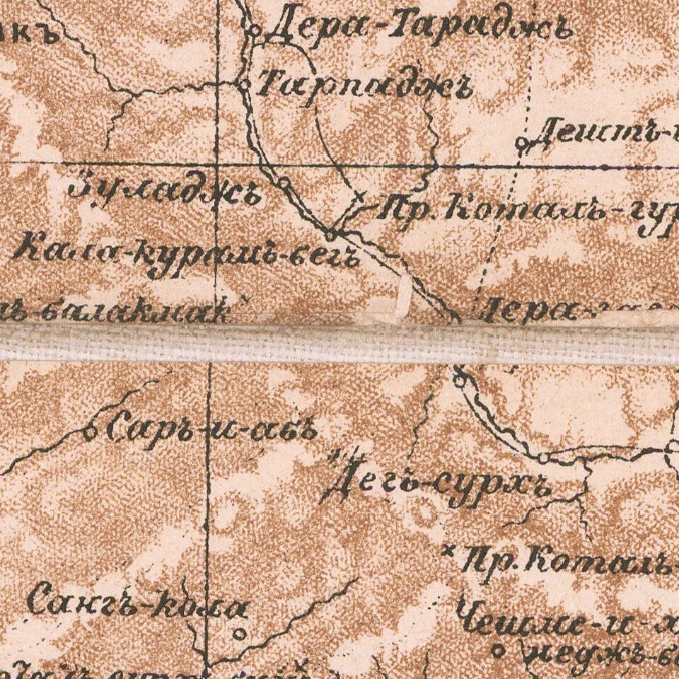 The map shows the territories between Khiva and Tashkent in the north to Kalat (Pakistan) and Delhi in the south, from Krasnovodsk (Turkmenbasy), Astrabad (Gorgan), Kerman in the west to Yarkant, Kashgar, and Leh in the east, thus covering the territories of modern-day Afghanistan, Uzbekistan, and Tajikistan, and parts of Turkmenistan, Kyrgyzstan, Iran, Pakistan, Xinjiang Uygur Autonomous Region of China, and even Kashmir, Himachal Pradesh and Punjab in India. Thorough and detailed in terms of topography, the map shows the complicated relief with larger and smaller mountain ranges, rivers, lakes, and deserts, marks settlements from the major centers up to “reconnaissance posts” (e.g., the one near Panjdeh/Kushka on the Afghan border), gives the names of the geographical regions, provinces, local tribes and outlines the main roads and caravan routes. The map also shows the first railway line in Turkmenistan, built during the Turkoman Campaign and going from the Caspian coast inland.