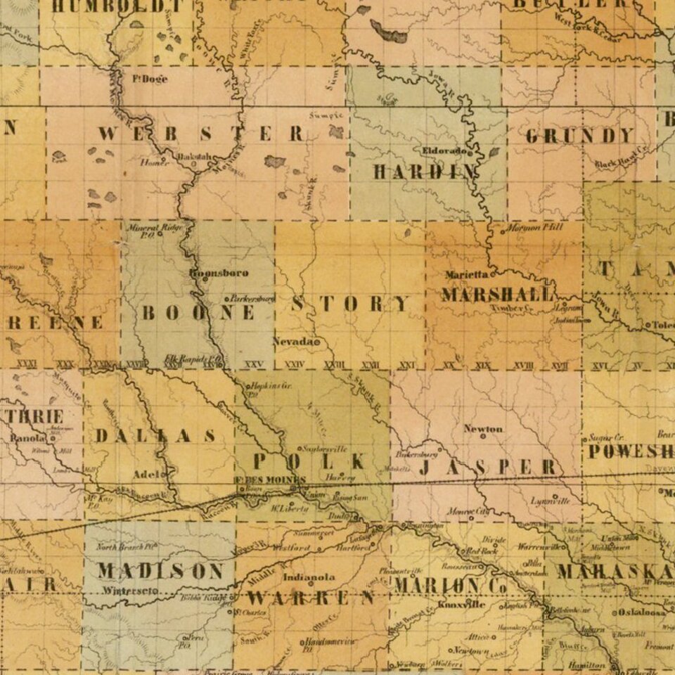 Rare separately issued map of Iowa, published in Kiel in a promotional tract, Der Staat Iowa geographisch und statistisch beschrieben von Theodor Olshausen in St. Louis in Staate Missouri . . ., published in 1855.