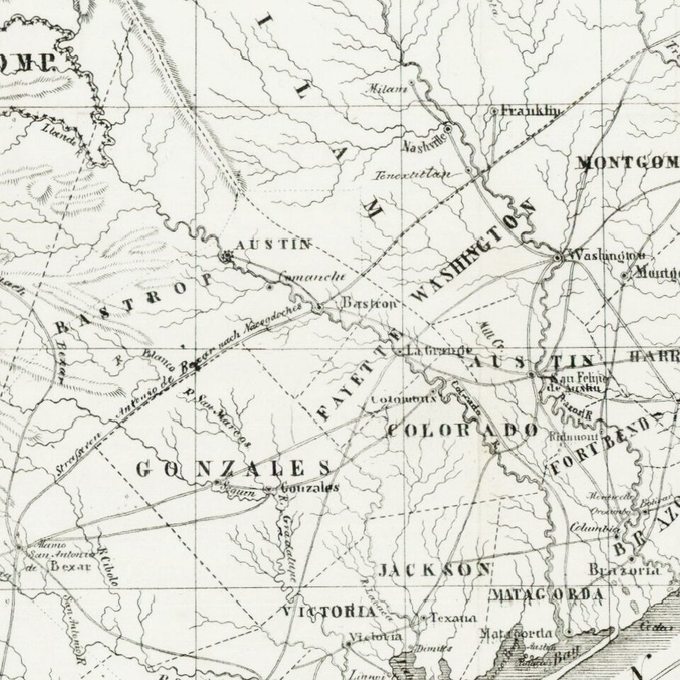 While similar in title to the Stempfle map of 1841 and Ehrenkreutz map of 1846, this map locates and names both of the grants referenced above. While we have not been able to confirm the source, the title is identical to the map in Gesammelte Acten-Stucke des Vereins zum Schutze deutscher Auswanderer in Texas (Mainz 1847), which is noted as item 1064 in the Sociedad Mexicana de Geografia y Estadistica's Materials para una cartografie mexicana por el ingeniero Lic. Manuel Orozco (Orozco y Berra: Mexico City, 1871) and also to the German edition of William Kennedy's book ( Geographie, Naturgeschichte und Topographie von Texas. Aus dem Englischen von Otto von Czarnowsky. Mit einer Karte von Texas, Frankfurt am Main, 1845).