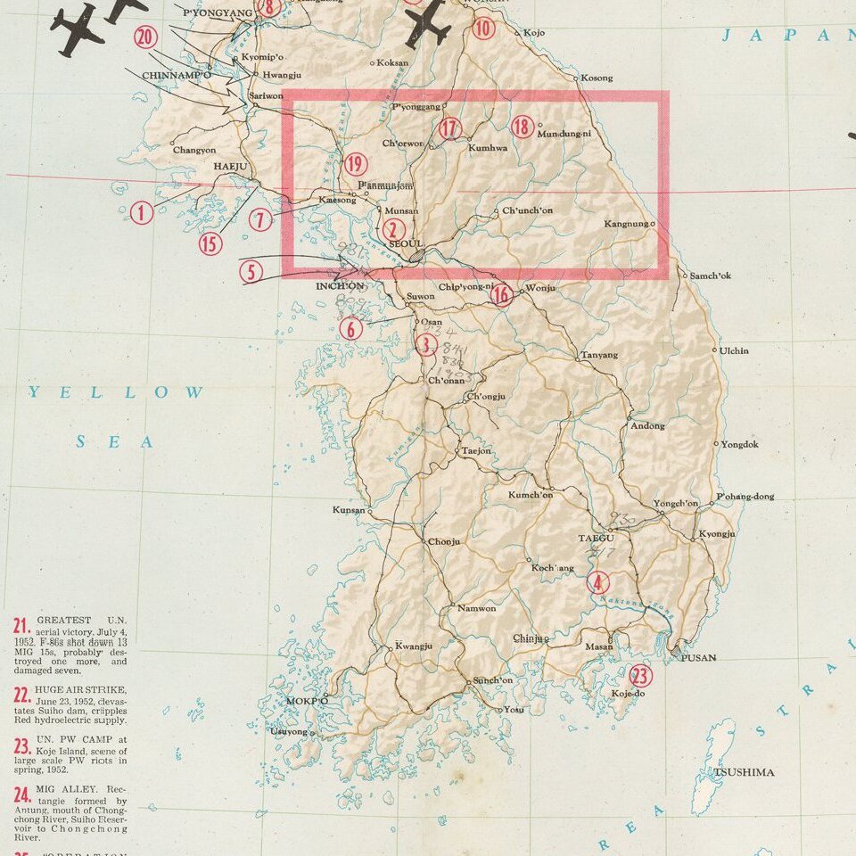 Decorative map of Korea, intended for distribution to soldiers stationed in Korea in the 1950s.
