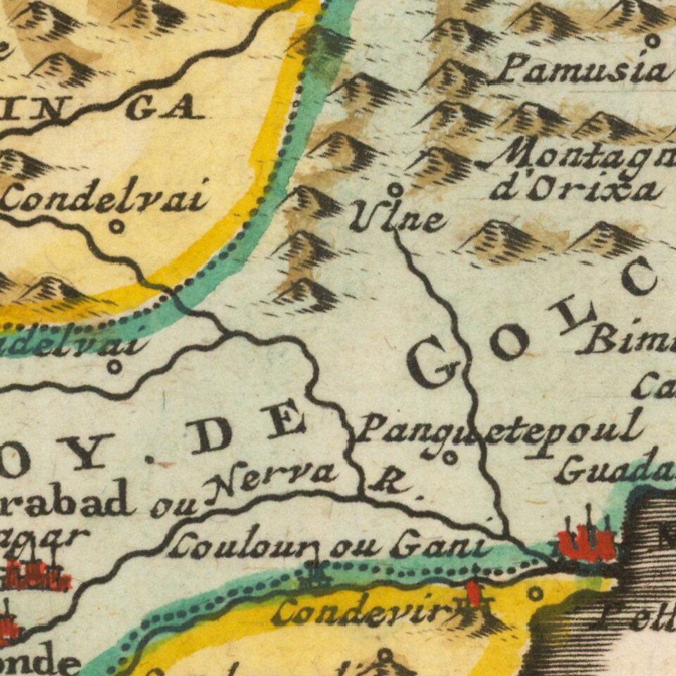 A highly attractive map embracing most of India, made during the height of the Mughal imperial expansion. The map encompasses most of India and Sri Lanka, showing cities, rivers, mountains, islands, political divisions, and more. An intriguing note describes a vast intertidal area at the mouth of the Indus River, supposedly the large tidal flats in the world. An elegant cartouche with elephants and beehive-dwellings completes the composition.