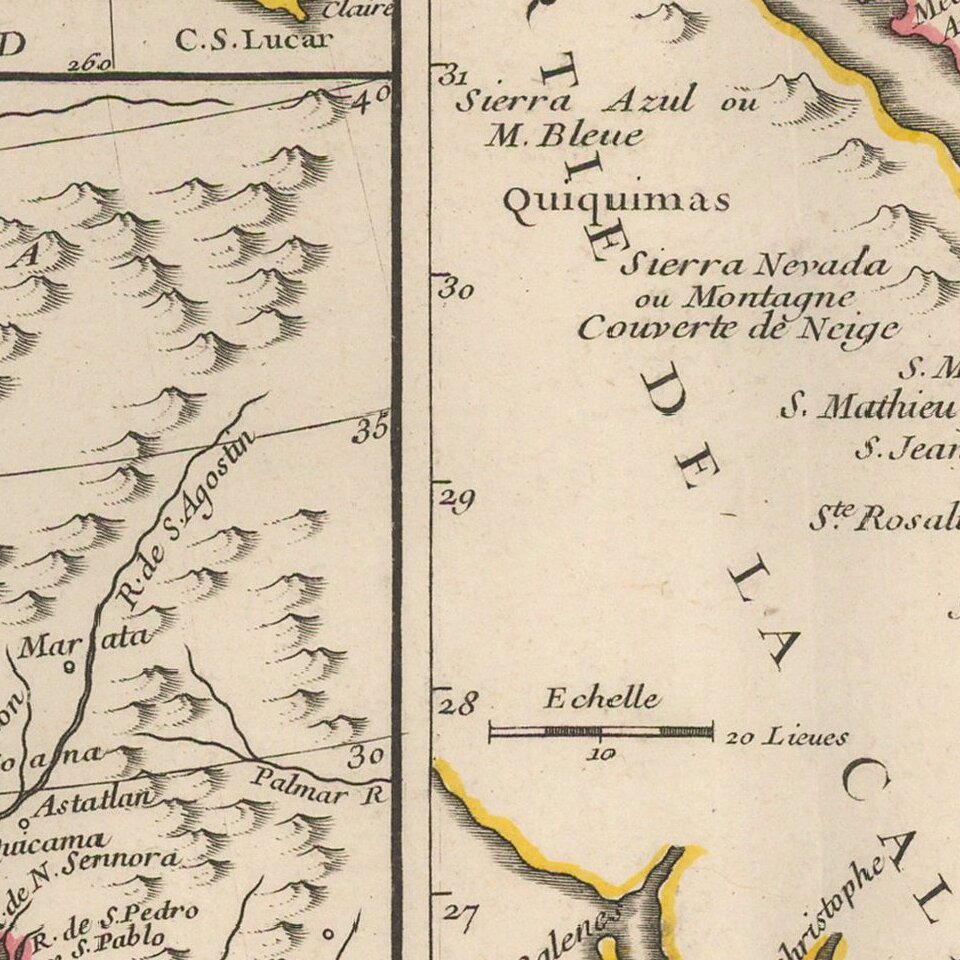 Bauche's mapsheet comprises three mappings of California as a peninsula, following the discoveries of Eusebio Kino, the Italian Jesuit missionary. Bauche includes the maps of Guillaume Delisle (upper center), Mathieu Neron Pecciolen (left), and Kino (right).