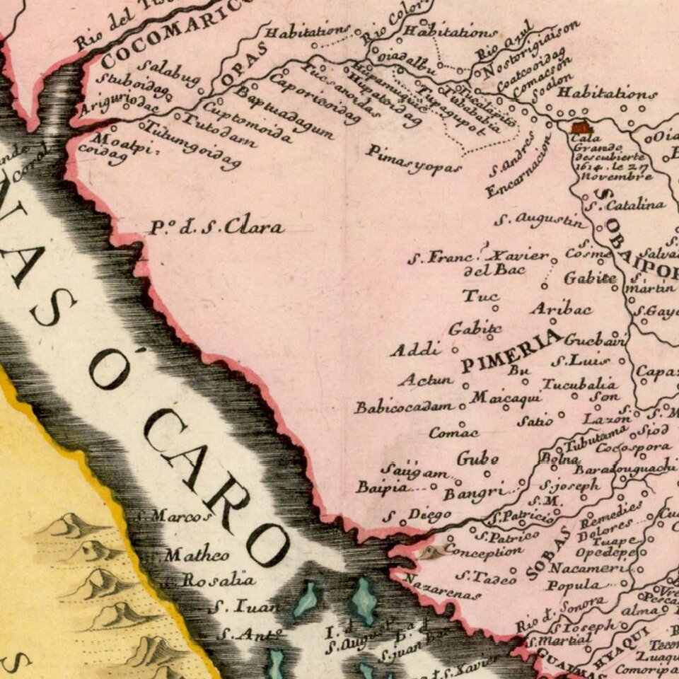 The title, which translates as “California or New Carolina, Place of the Apostolic Works of the Society of Jesus in North America,” derives from Kino’s original summaries of his expeditions to California. The inset text below the title provides a history of California up to 1694. De Fer notes that the map is drawn from a map previously transmitted by the Viceroy of New Spain to the Academie de Sciences in France.
