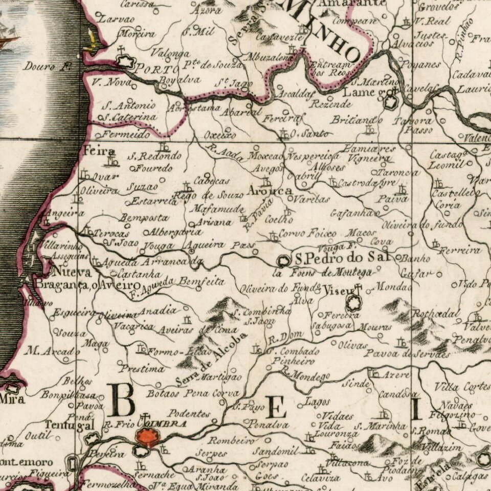Rare and highly decorative regional map of the north part of Portugal, colored by regions.