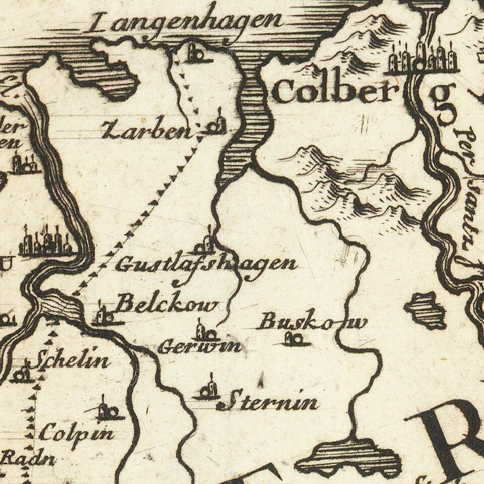 Pomerania was bitterly fought over during the Scanian War, waged between the Holy Roman Empire and Denmark-Norway against Sweden and France. During a prolonged campaign, Sweden initially tried to invade Brandenburg-Pomerania but ended up losing Swedish Pomerania instead. The region became part of the Holy Roman Empire for several years, but Fredrick William I was forced to cede his gains in Pomerania at the end of the war in the 1679 Treaty of Saint-Germain-En-Laye. Pomerania would again change hands many times in the half-century after this map was made.