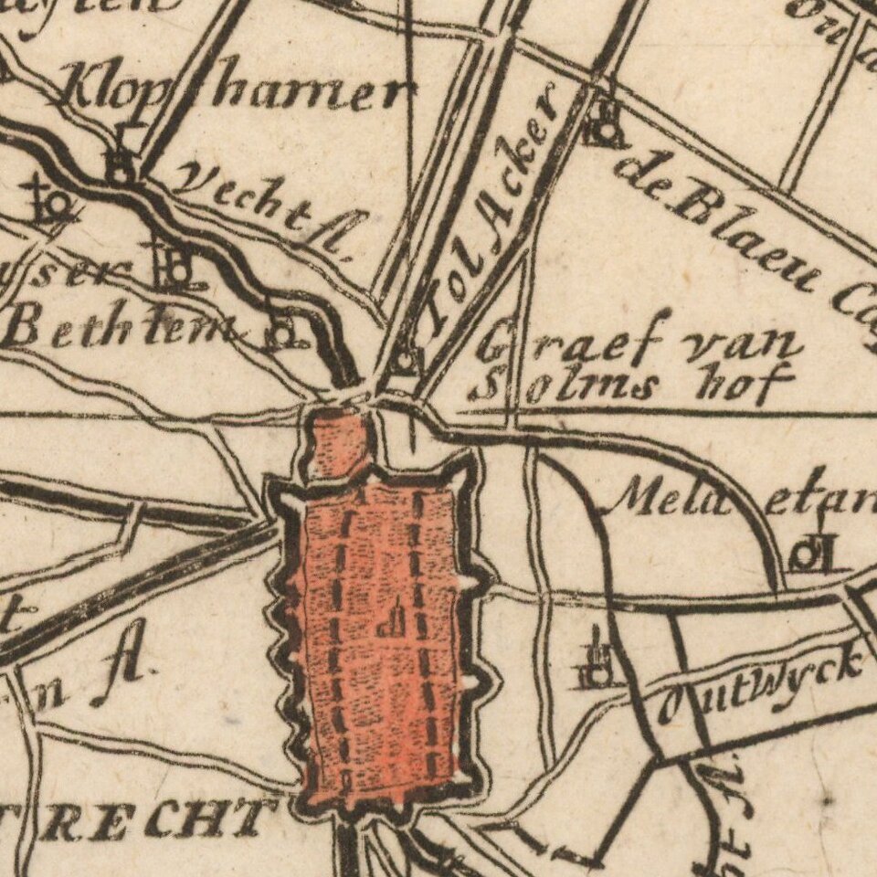 The map features towns such as Yselstein, Woerde, Montfoort, Kulenborg, etc. and includes roads and waterways. Centered on Utrecht, the map reaches Amerfoort, Tiel, Gorckum, Goude and Amsterdam.