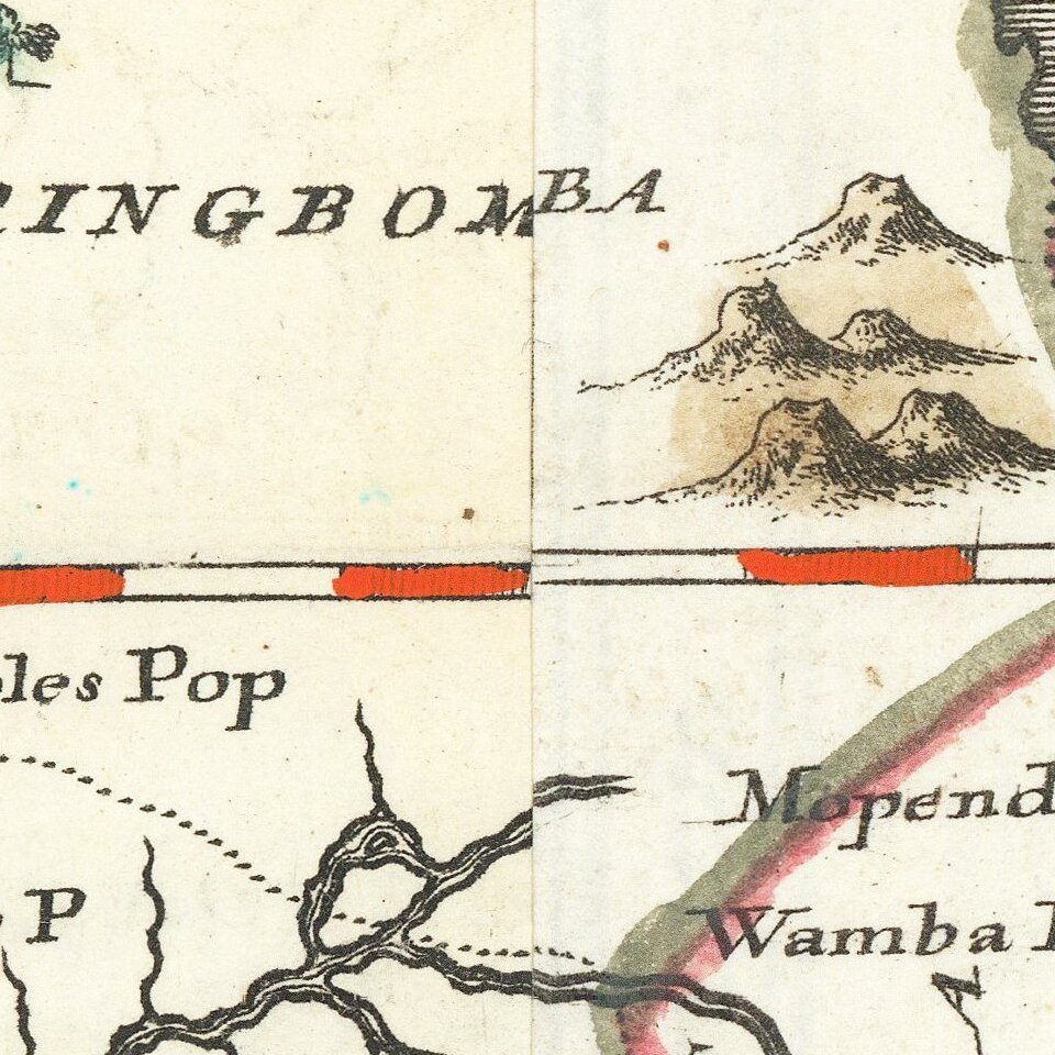 Beside the fascinating detail, the maps are richly decorated with animals and scenes of horsemen in combat or hunting the animals. The large title cartouche on the west sheet is surrounded by several indigenous animals including ostrich, crocodile, lions, elephant and camel. On the other sheet is a large scene in Central Africa with an angel blowing a trumpet, while another holds the corner of the tent and a scribe standing on a globe records information concerning the origin of the Nile on the side of the tent. Also included in the scene is an allegorical figure representing Father Nile with the river flowing from his overturned urn.