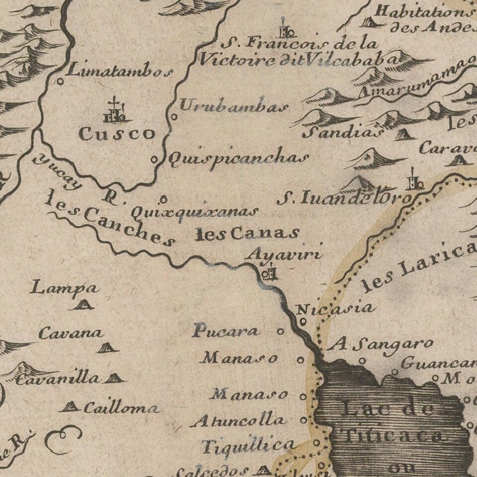 Fine example of De Fer's map of Peru and contiguous parts of the Andes and Upper Amazon River Basin.